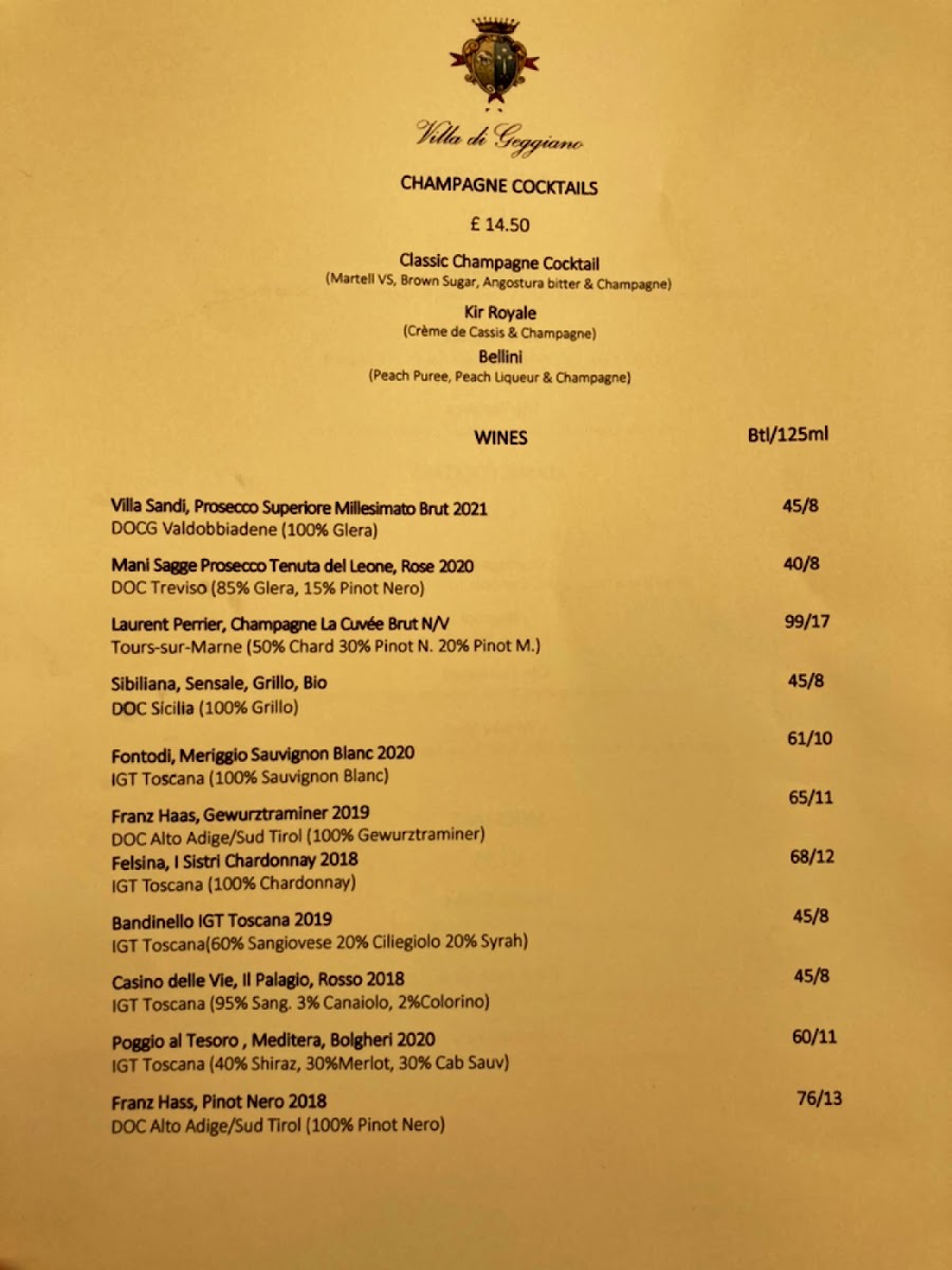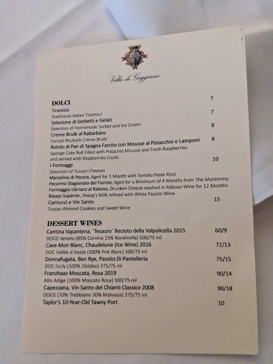 The dessert menu is equally impressive, with the classic tiramisu being a crowd favorite. It’s perfectly balanced-creamy, with just the right amount of coffee flavor. The wine list at Villa Di Geggiano is well-curated, featuring a selection of Italian wines that pair perfectly with the dishes, making for an enhanced dining experience.